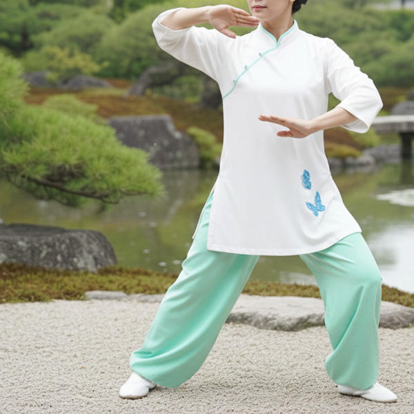 いつも、ラインで購入させて頂いてます。今回は、中華刺繍デザイン太極拳服のクリームイエローと無地シンプル太極拳パンツのミントグリーンを。160cm50㌔でどちらもLにして正解。いつも、ストレッチ素材でМでしたが、袖なしなのでインナーを着て太極拳演舞が大丈夫。刺繍も素敵です。