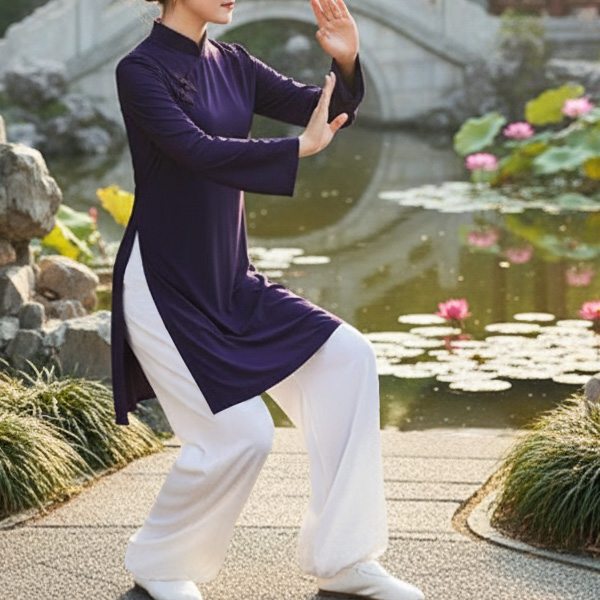 長袖ストレッチ太極拳服、先日、クラブ内での発表会で、みんなで着用しました。スタイルが良く見えるのはもちろん、ダークパープルの色がきれいで、とても舞台映えしました。大好評でした。細身のラインなので、着ると知らず知らずに背筋が伸びるようです。凛とした、落ち着きのあるたたずまいが出るという、とても嬉しい効果もありました。素敵なウエアこれからもよろしくお願いします。